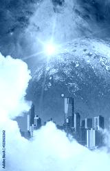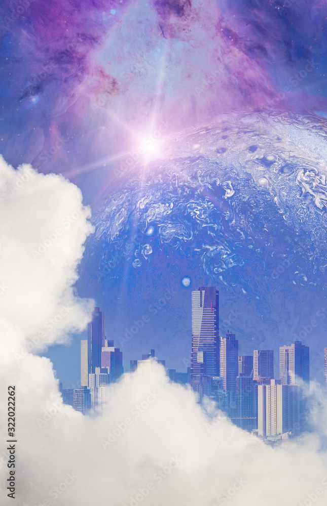 Futuristic scene for science fiction novel book cover - beautiful white clouds reveal modern city skyscrapers and huge alien planet with galaxy. Elements of this image are furnished by NASA