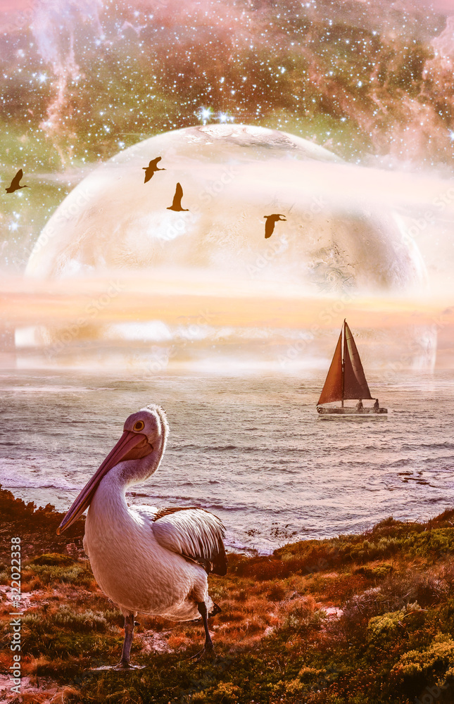Fiction book cover design template. Sailboat in the ocean with pelican on shore and alien planet on the horizon. Elements of this image are furnished by NASA