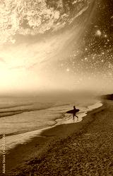 Vertical book cover design template. Fantasy landscape of surfer silhouette walking on the beach of alien planet. Elements of this image furnished by NASA