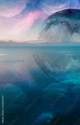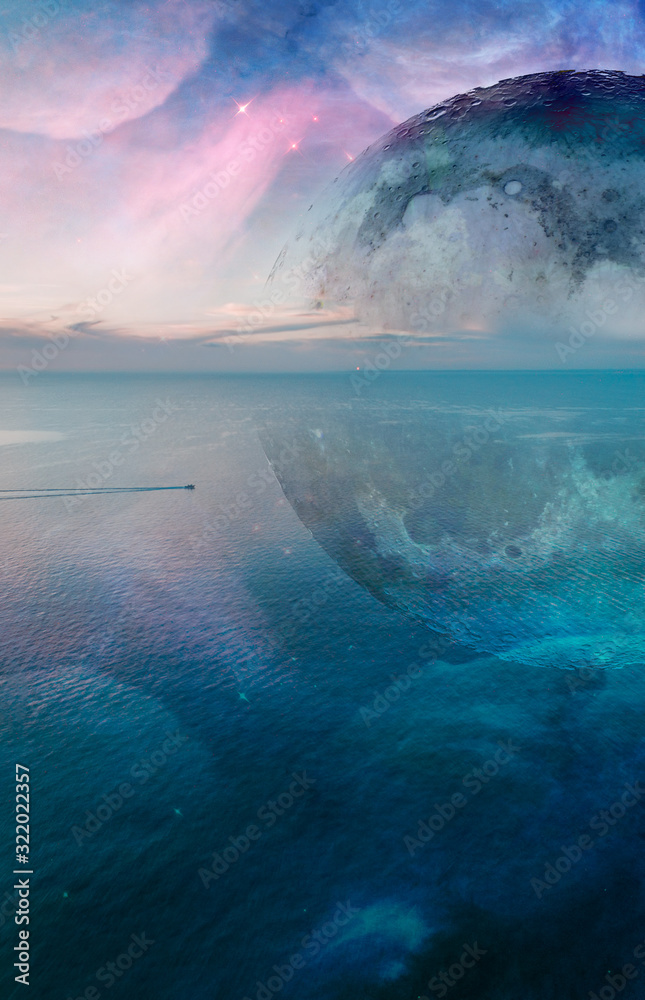 Small fishing boat sailing across calm sea with huge alien planet and galaxy in the sky reflecting in the water. Book cover design template. Elements of this image are furnished by NASA