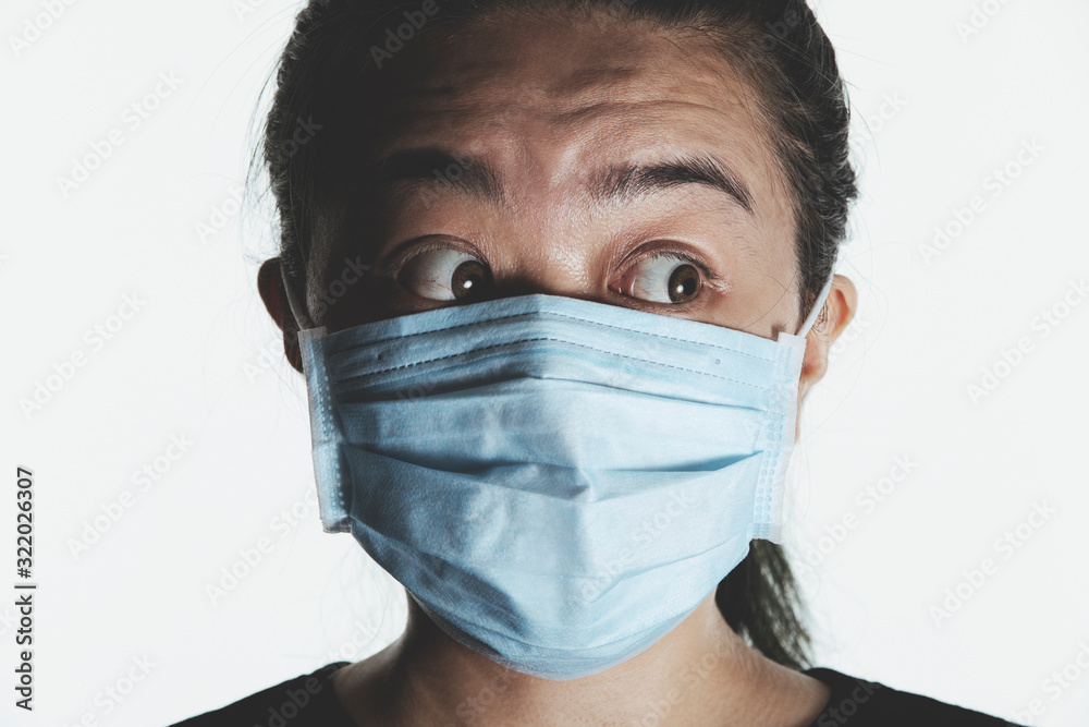 a female wearing a medical mask with a panic facial expression.
