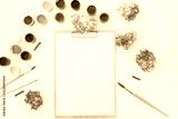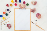 Acrylic paints and brushes at white background. Flat lay, top view