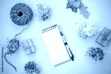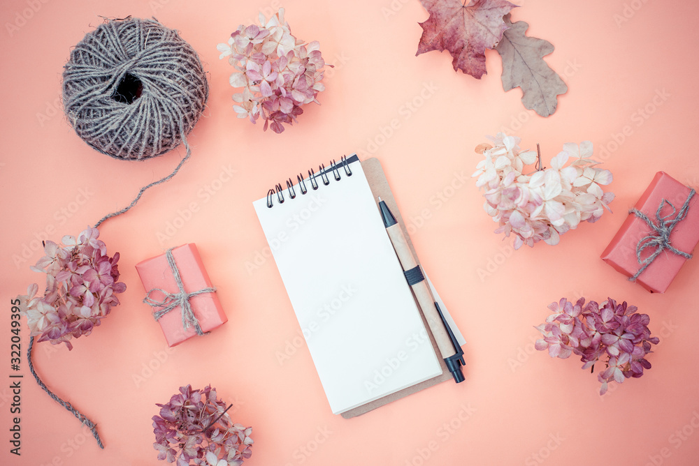 Workspace with notebook on peach background. Autumn composition with dry flowers and autumn leaves. Flat lay, top view.