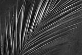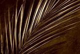 Closeup of golden palm leaf on abstract dark grey textured background. Tropical conceptual luxury elegant trendy art deco summer background. Flat lay. Open composition