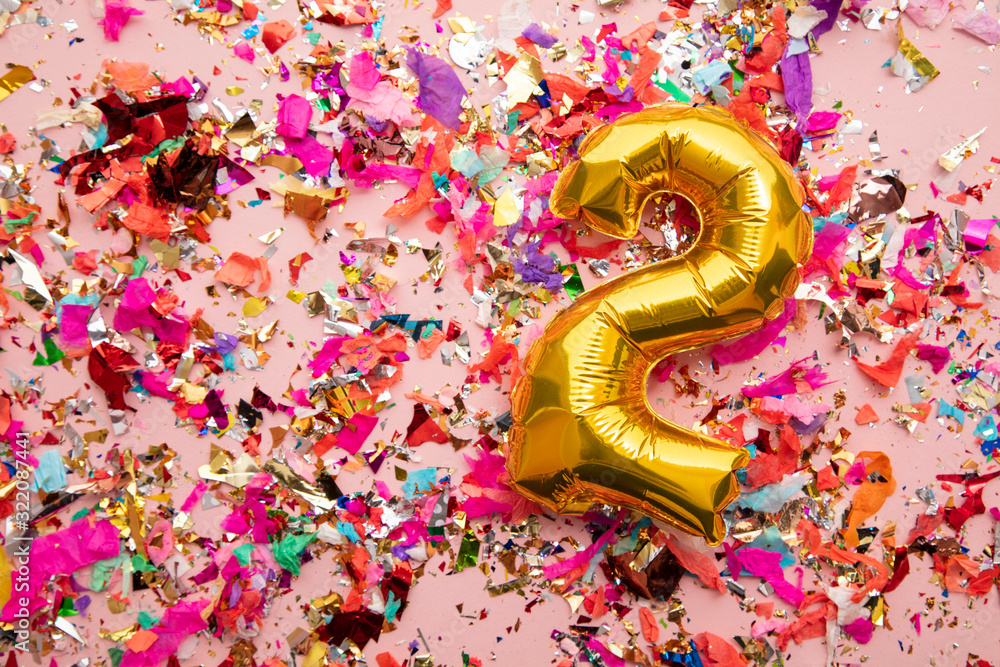 Number 2 gold birthday celebration balloon on a confetti glitter background
