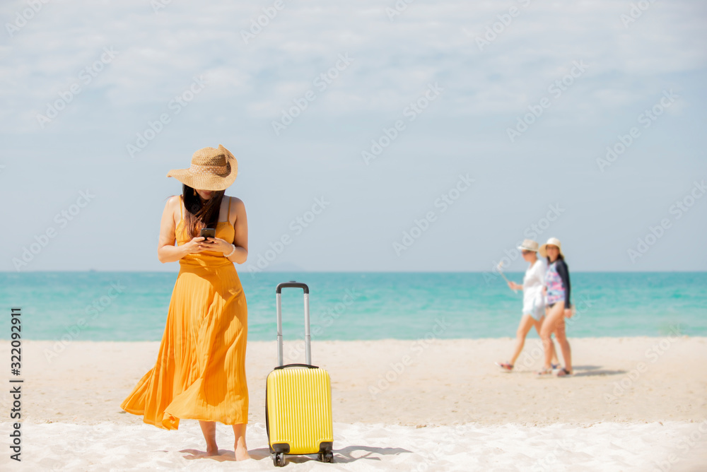 Happy traveler asian woman standing on beach with suitcase using smart phone enjoys her tropical vacation
