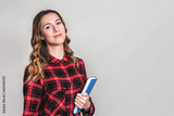 A young student girl in a plaid shirt with wavy hair holds a notebook on a grey background, copy space. Student girl conducting a survey, testing. Portrait of a serious student girl