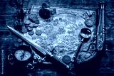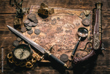 Pirate treasure map and other accessories on brown wooden table flat lay background.