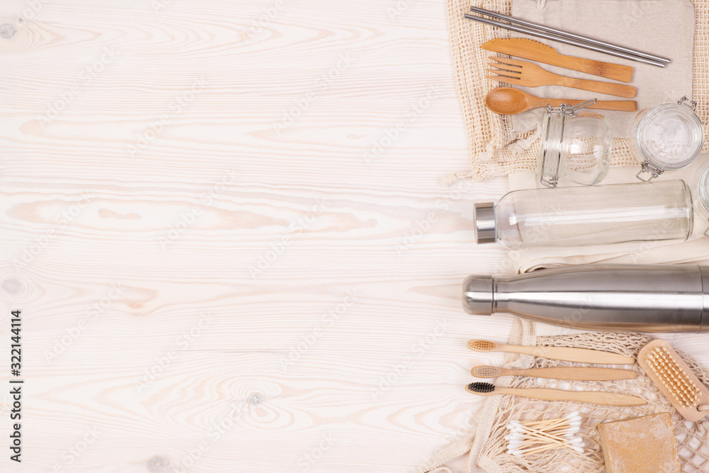 Zero waste eco friendly reusable objects such as linen shopping bags, glass jars and wooden toothbrushes, top view with copy space