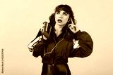 Cheerful gorgeous girl in clothes in the style of the 90s, with a vintage cassette player and headphones, in the studio on a white background. Music, emotions, fashion