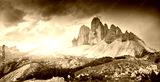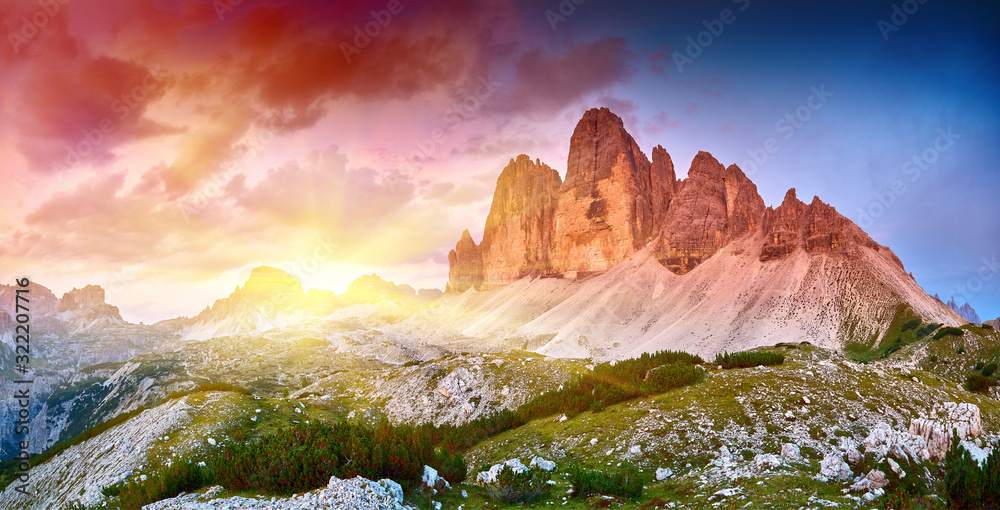 Amazing view of The Three Peaks of Lavaredo (Tre Cime di Lavaredo) at sunrise. Trentino Alto Adidge, Dolomites mountains, South Tyrol, Italy, Europe. UNESCO