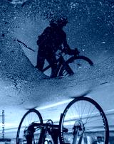 Greyscale of the reflection of a person with a bicycle on the wet asphalt after the rain