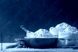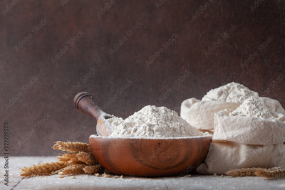 Burlap bag and bowl with wheat flour and wheat dust on wooden table. Ingredient for baking.
