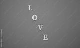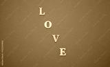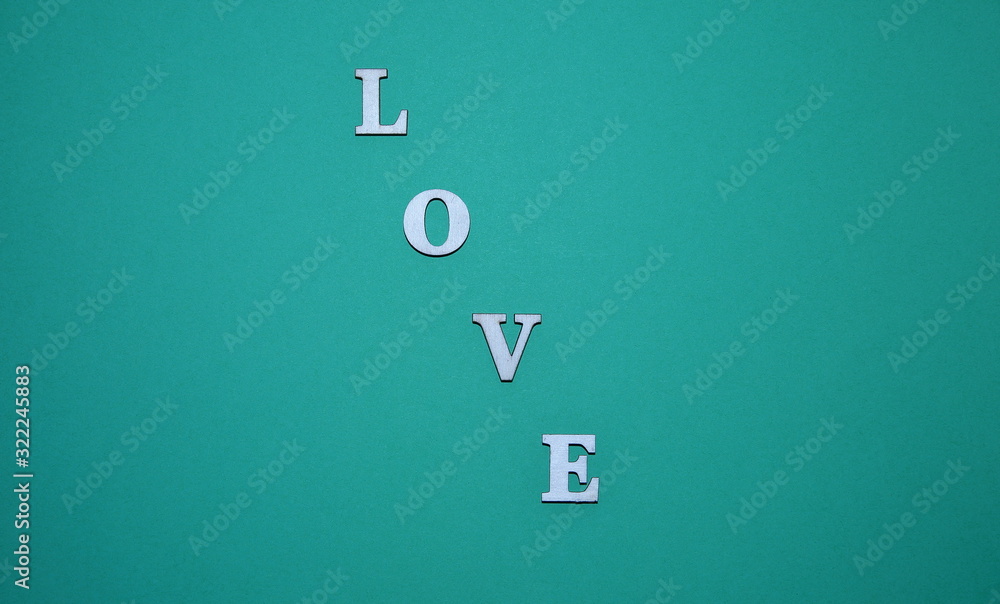 Inscription LOVE made of wooden natural letters in the middle of aquamarine color background, vignette in corners