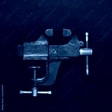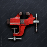 Vintage mechanical hand vise clamp red color on on grey background, top view. Creative design idea