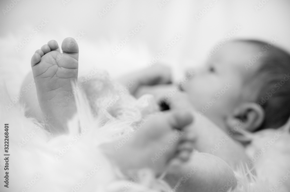 Feet of a newborn baby in the hands of parents. Happy family moment and concept.