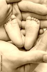 Feet of a newborn baby in the hands of parents. Happy family moment and concept.