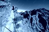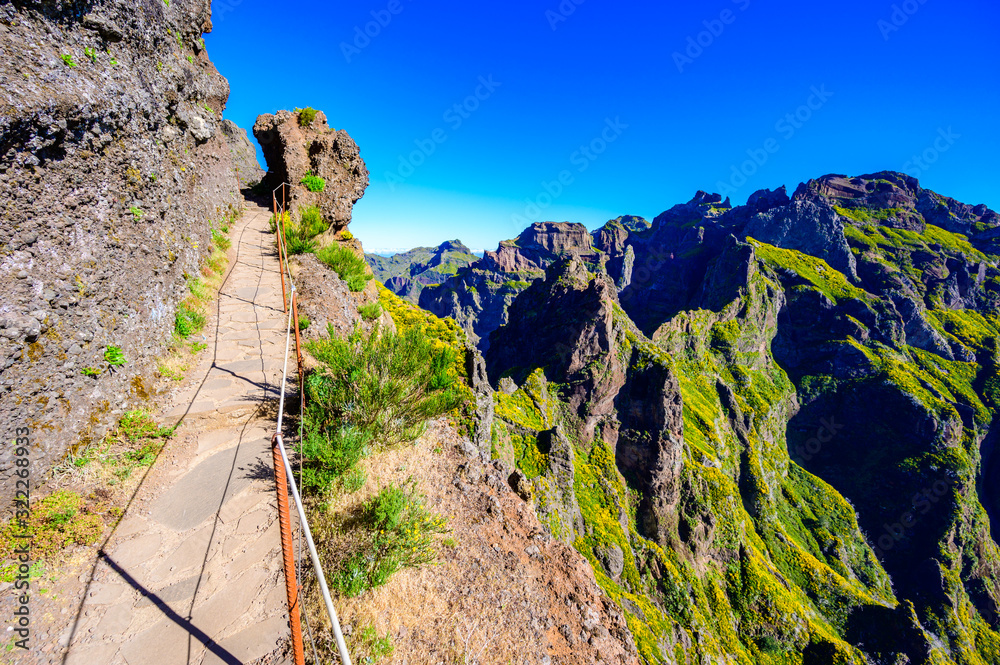 Beautiful hiking trail from Pico do Arieiro to Pico Ruivo, Madeira island. Footpath PR1 - Vereda do Areeiro. On summy summer day above the clouds. Portugal.