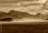 Beautiful Scenery Scenic Panoramic View Red Sand Desert and Ancient Sandstone Mountains Landscape in Wadi Rum, Jordan during a Sandstorm
