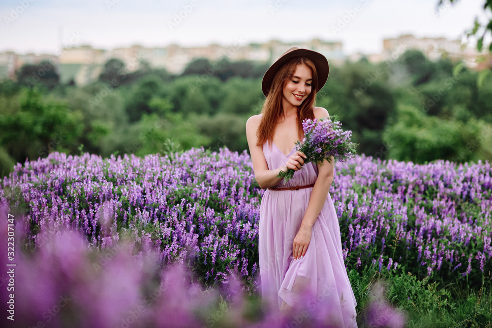 Red-haired girl in a hat lies in the grass with purple flowers. Young woman smile in nature. lady walks on a lavender field.