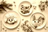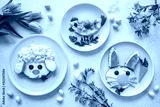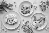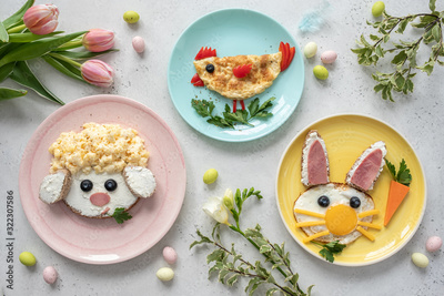 Colorful breakfast meal for kids. Funny Easter food art, top view.