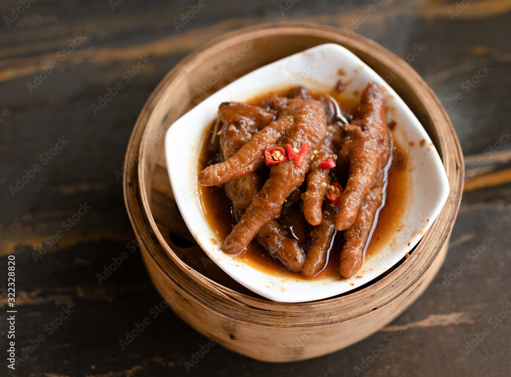 Chicken feet dim sum in bamboo steamer chinese cuisine