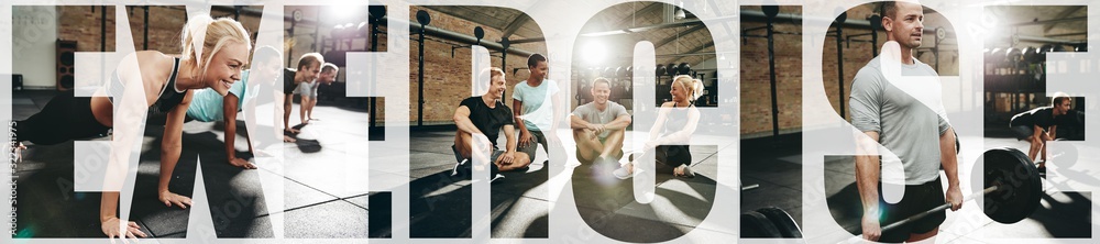 Collage of smiling people exercising in a gym together