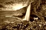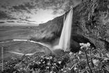 Incredible sunset on Seljalandsfoss. One of the most beautiful waterfalls on the Iceland, Europe. Popular and famous tourist attraction summer holiday destination in on South Iceland. Travel postcard.