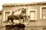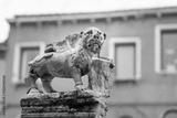 Figure of a lion holding a shield made of stone