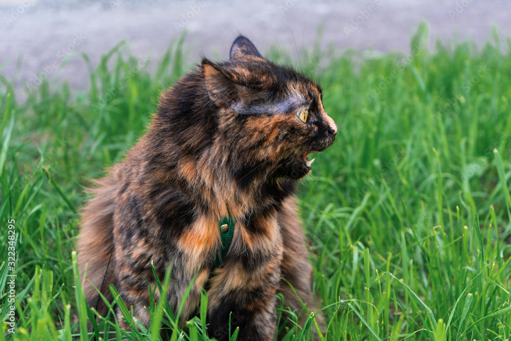 A furry cat walks in a harness in the grass and, opening his mouth, swears, hisses or yawns.