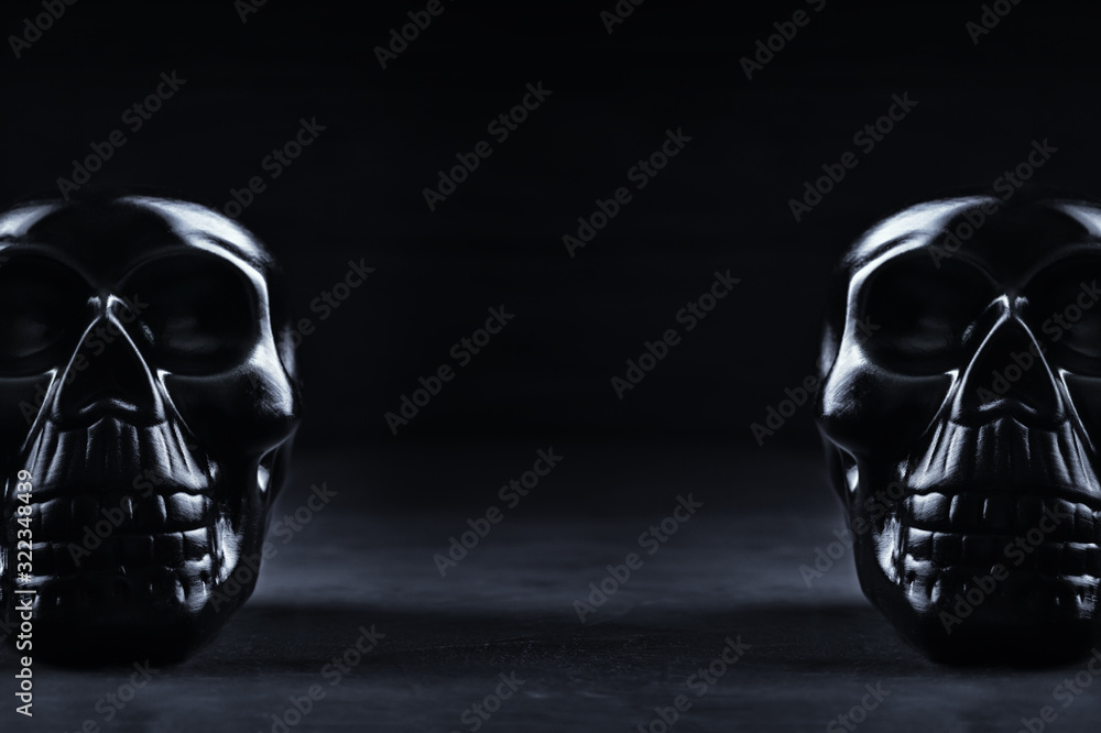 Two black skulls on a black background on the edges of the frame, in the center of the copy space.