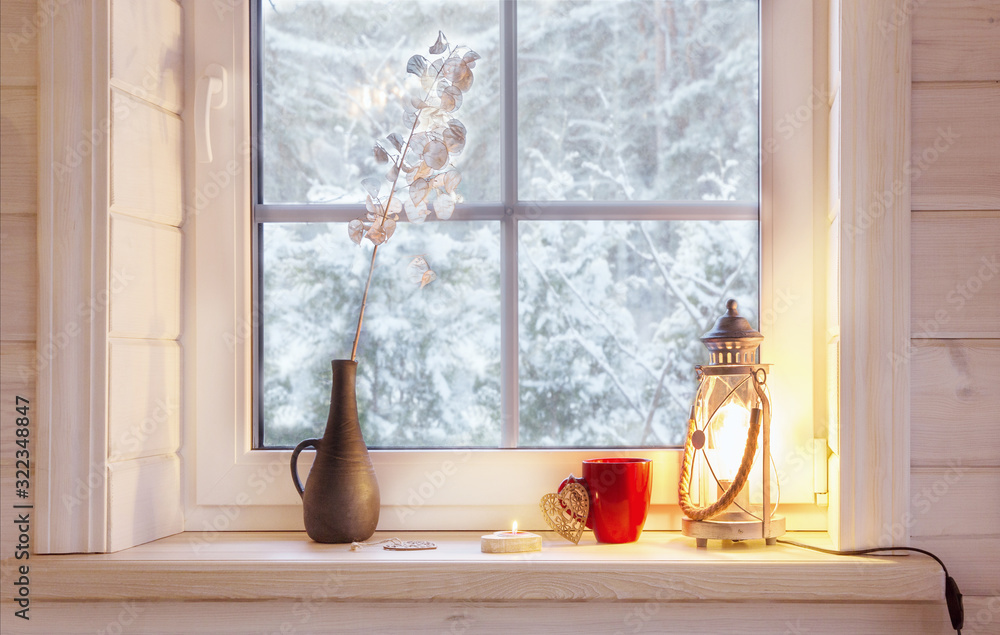 Festive lantern, red mug and heart on a wooden window sill in winter indoors.