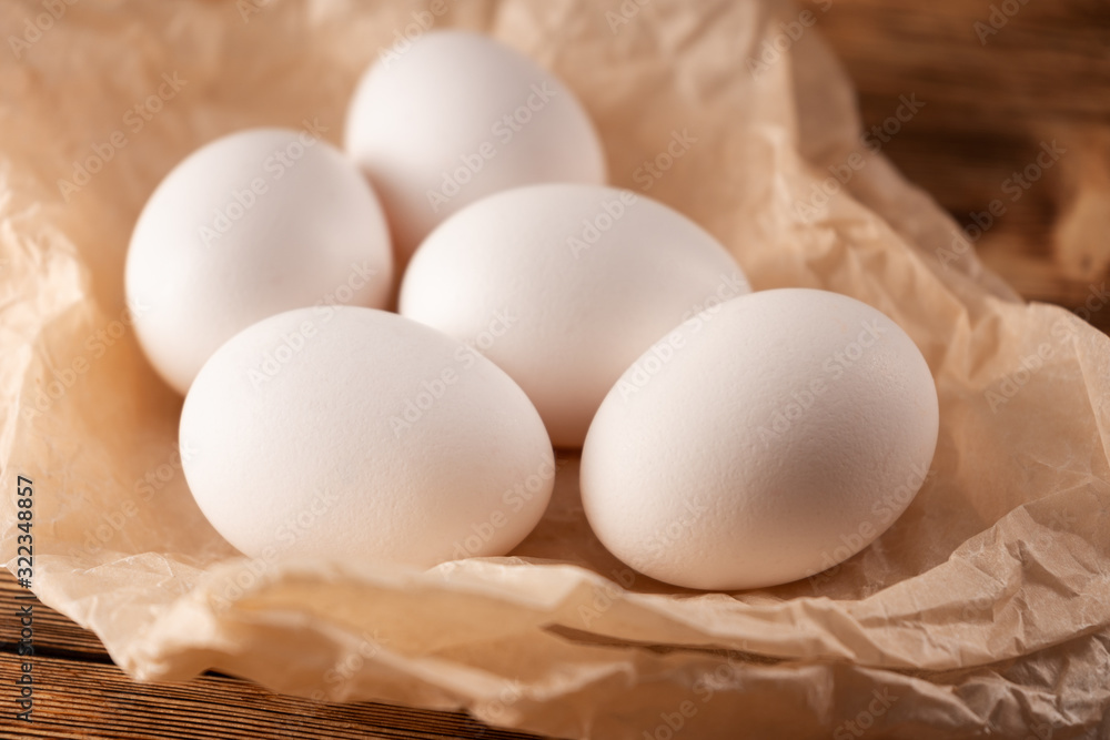 Rustic chicken eggs on parchment paper on a wooden plank table. Close up.
