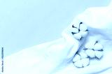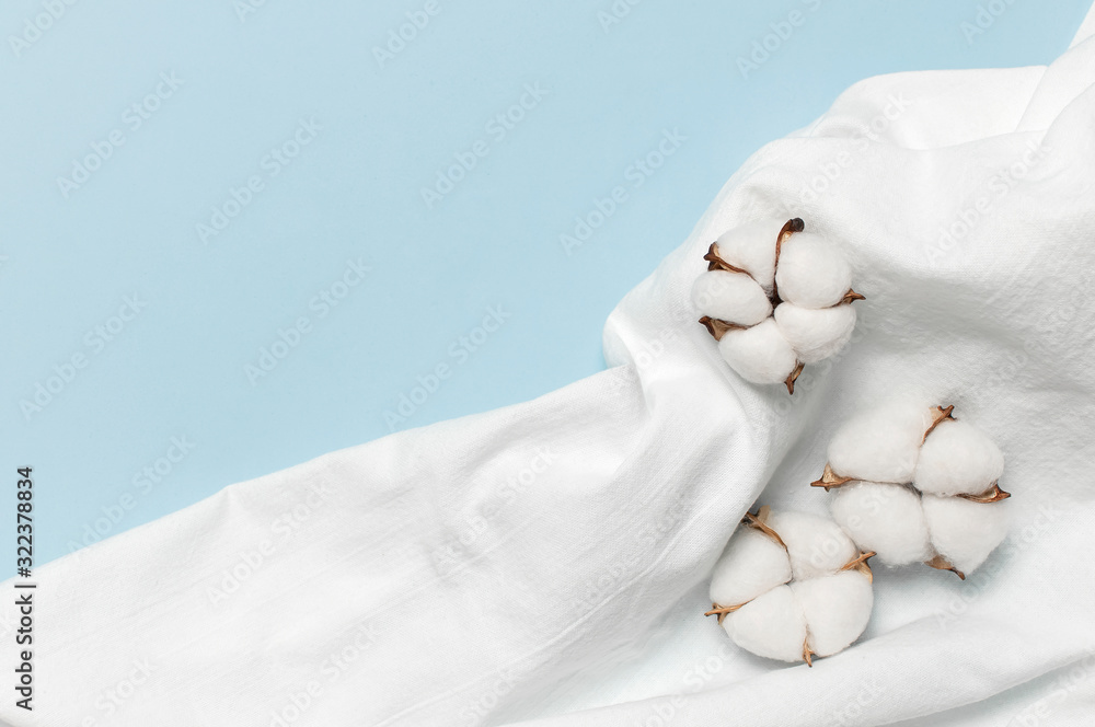 Flat lay Beautiful cotton flowers and white natural cotton fabric on blue background top view copy space. Delicate white cotton flowers. Fabric production background. Eco textiles