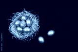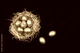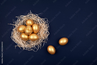 Top view of golden colored Easter eggs in decorative nest on dark blue background. Happy Easter greeting card. Easter background. Place for text.