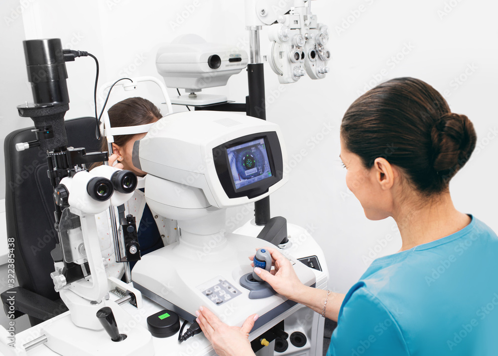 Female doctor checks eyesight of a child on modern equipment in clinic. Tonometer measures patient’s eye pressure