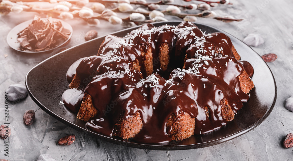 Easter cake with chocolate, coconut, spring flowers on a stone background. Happy Easter celebration