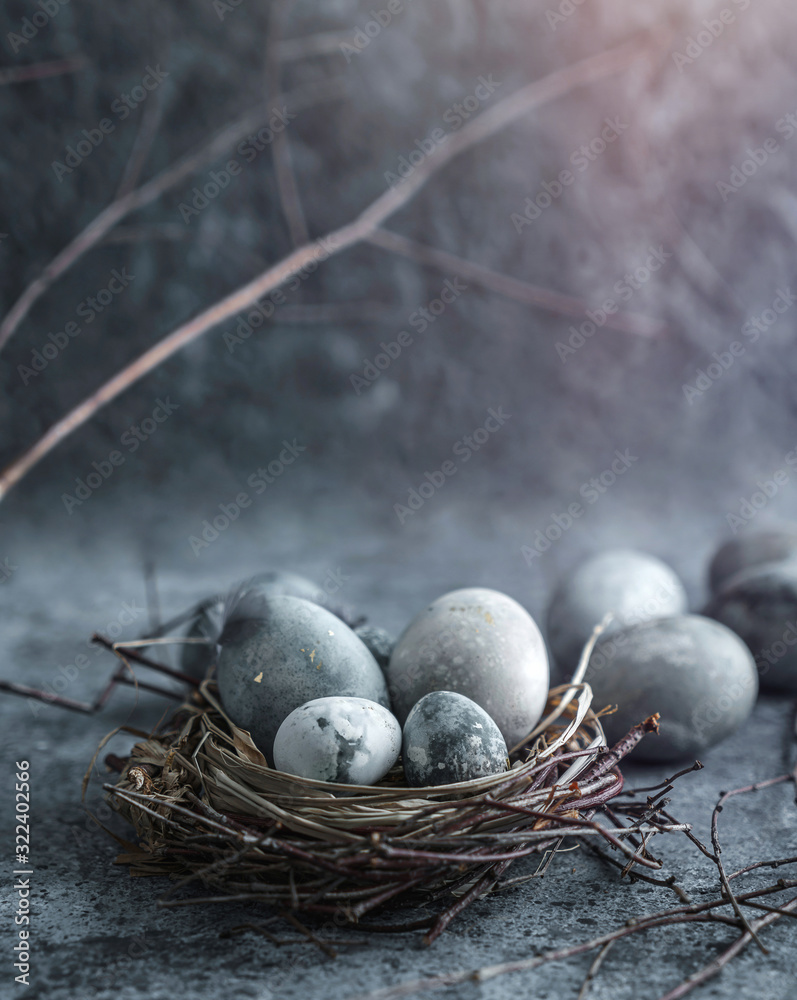 Easter eggs in bird nest with feathers on blue background with light. Happy Easter holiday, close up