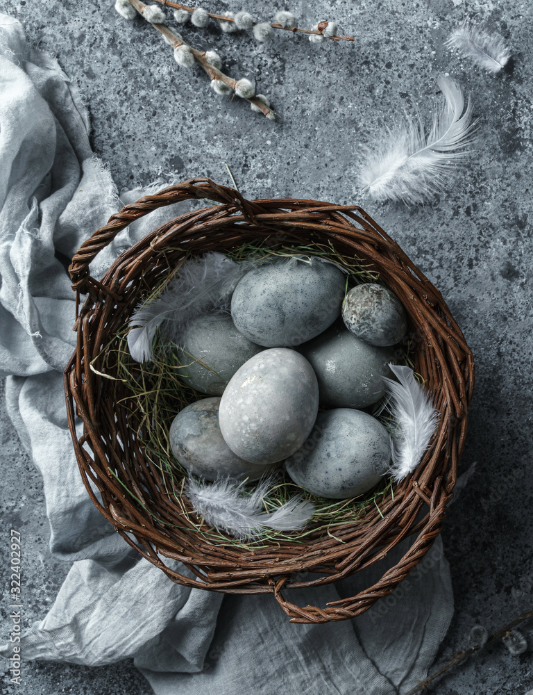 Easter eggs in wicker basket with feathers and spring flowers on blue background. Happy Easter holiday, top view, flat lay