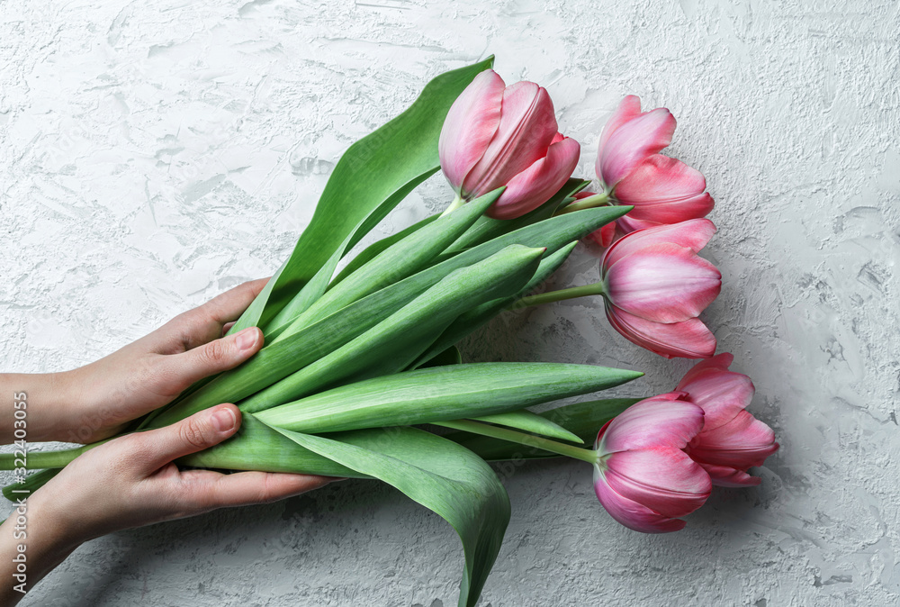 Hands holding pink tulips flowers on white background. Card for Mothers day, 8 March, Happy Easter. Waiting for spring. Greeting card. Flat lay, top view