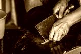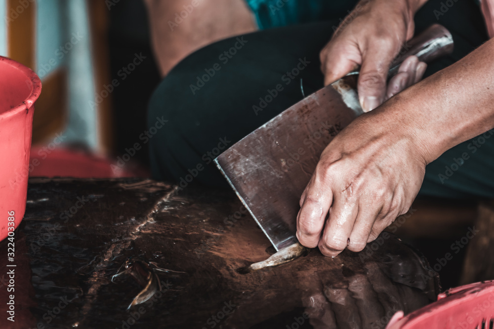 Chinese person peeling skin off small fish