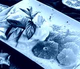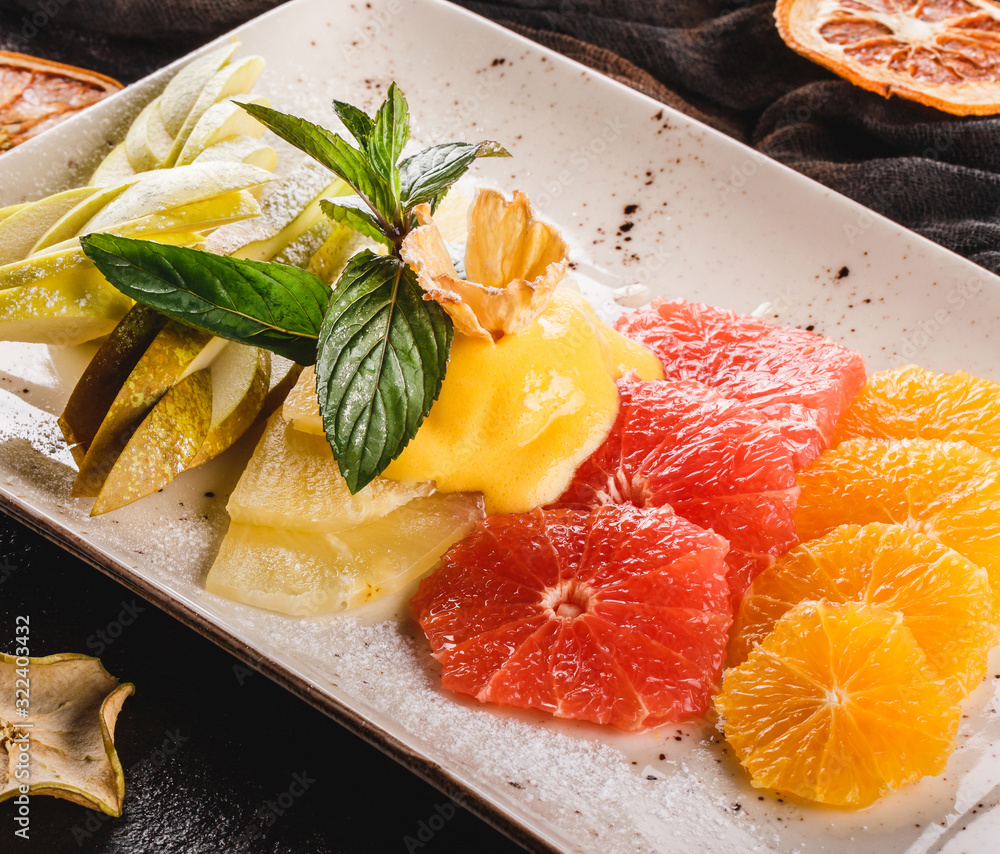Ice cream with fruits, orange, apple, pineapple, grapefruit on light plate over dark background. Dessert and sweets. Top view