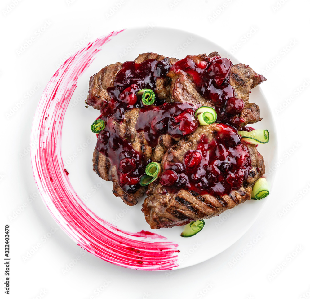 Grilled ribeye beef steaks with berry sauce on white plate isolated on white background. Hot Meat Dishes. Top view