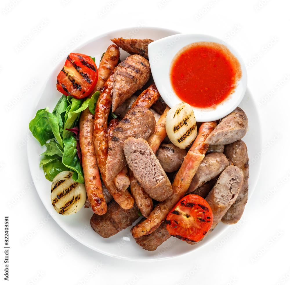 Assorted delicious grilled meat and sausages with tomatoes and bbq sauce on white plate isolated on white background. Hot Meat Dishes. Top view
