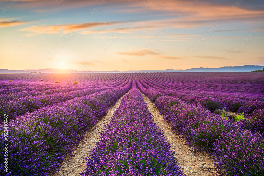 Lavender flowers fields at sunset. Provence, France