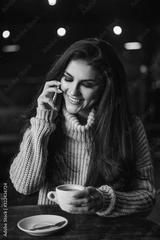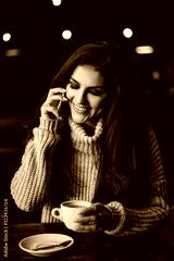 Woman talking on phone and drinking coffee in a cafe.