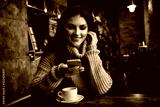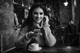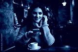 Woman using phone and drinking coffee in a cafe.