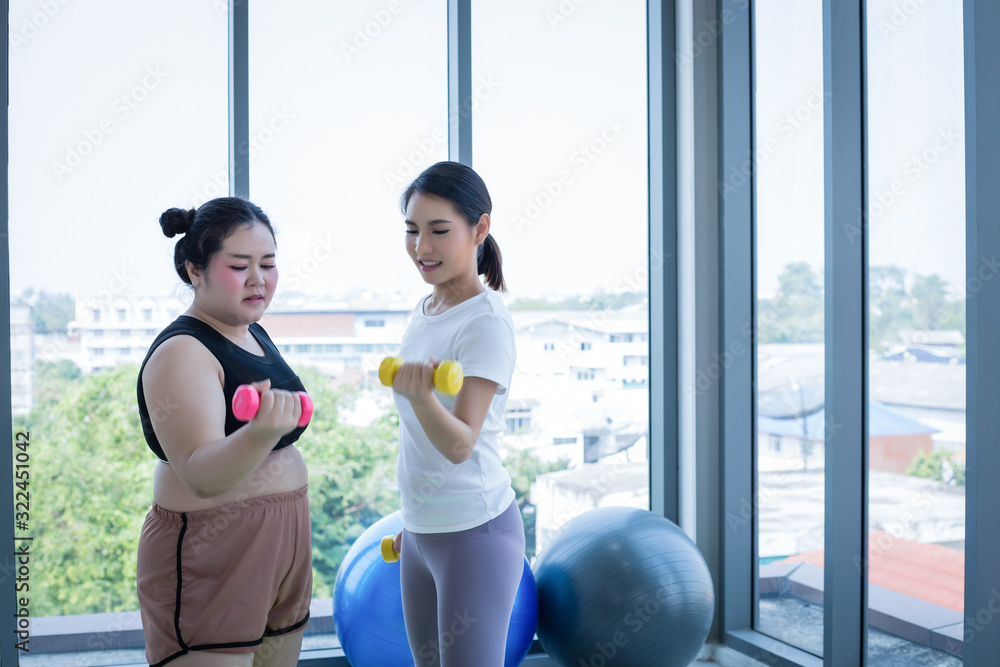 Asian Fat woman and trainer work out in the fitness class and The trainer recommends exercise for weight loss for obese women