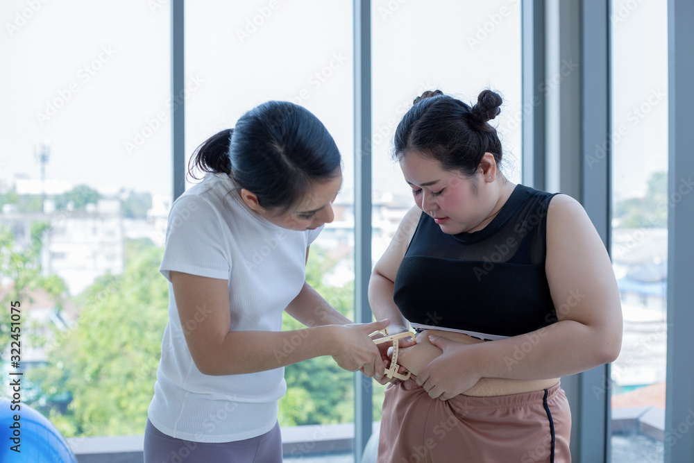 Young female trainer measuring fat layer of overweight woman with caliper at fitness