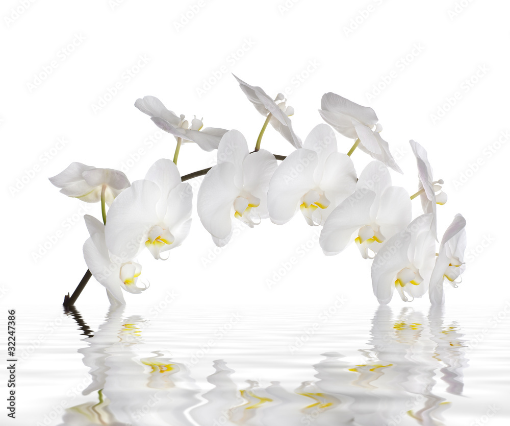 Riflesso in acqua di un'orchidea bianca